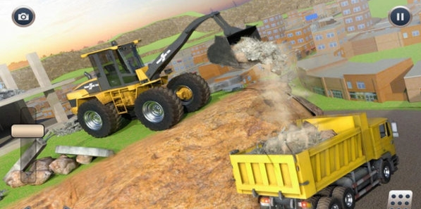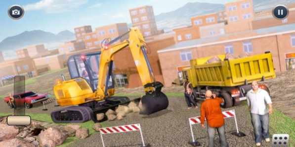 3、呈现建筑施工场景有未完工建筑、起重机等,界面有控制按钮方向、操作键、相机和暂停图标,展现车辆协同作业的内容。