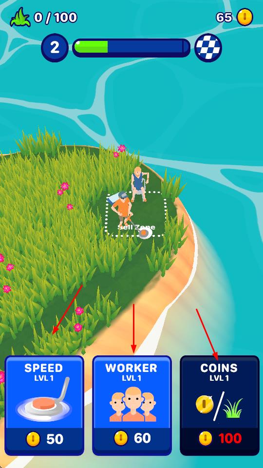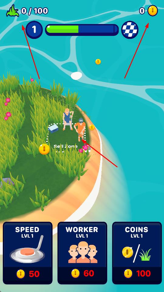 2、在移动过程中,将收集到的草丛运送到SELLZONE区域进行售卖,获取金币奖励,同时关注上方的关卡信息和金币数量。