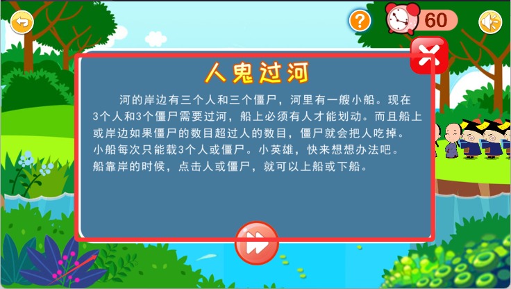 3、人鬼过河则让三位人类与三只僵尸借助小船双向渡河,确保任一岸上人类数量不低于僵尸数量,否则人类将被“吃掉”,锻炼逻辑推理能力。