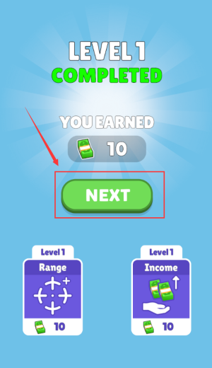 4、点击红框NEXT按钮,领取10金币进入下一关。