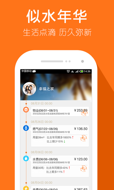 家年华app是一款家庭生活的管理应用,主要是针对家庭繁杂的各类生活账单进行管理,例如电费、水费、燃气费等等一切费用支出,帮你记录并生成图表账单,方便您的对比分析,同时软件还具有针对你的用电量给您节能建议的功能,从此家庭账单无需记事本,一款软件帮你轻松管理统计,方便快捷,需要的朋友就赶快来下载体验吧!