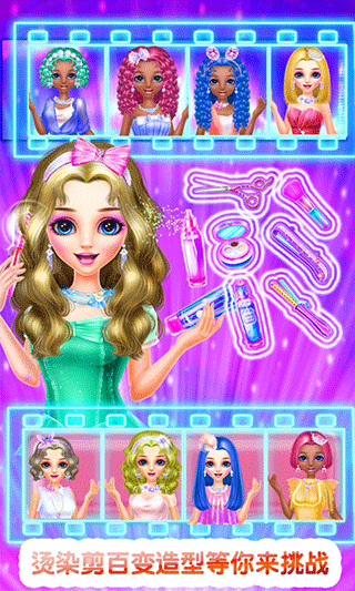 2、丰富的美发工具与染膏色板,兼容多种操作手势,包括滑动剪刀、长按染发、拖动发饰等,极大提升互动趣味。
