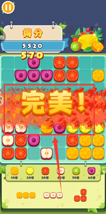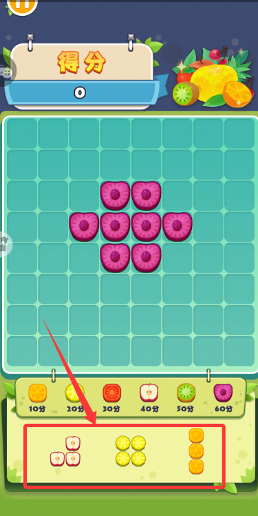 3、拖动下方水果组到棋盘,让三个及以上同水果相连,触发消除获取分数。