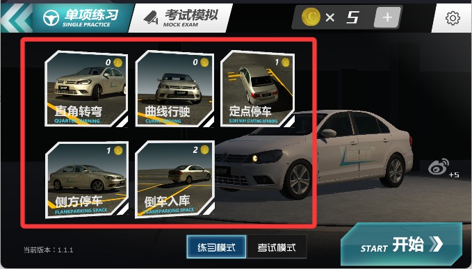 1、选择练习或考试模式后,先进行单项练习,如定点停车、直角转弯,通过后解锁下一项目,逐步掌握要领。