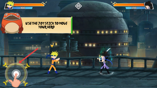 1、进入游戏对战,用左下角摇杆JOYSTICK控制己方黄发角色移动,调整与敌方站位。