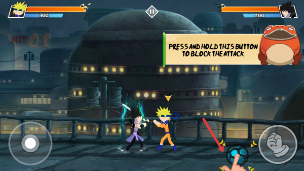 3、遇敌方进攻,长按右下角蓝色格挡按钮,可抵御攻击,减少己方黄发角色所受伤害。