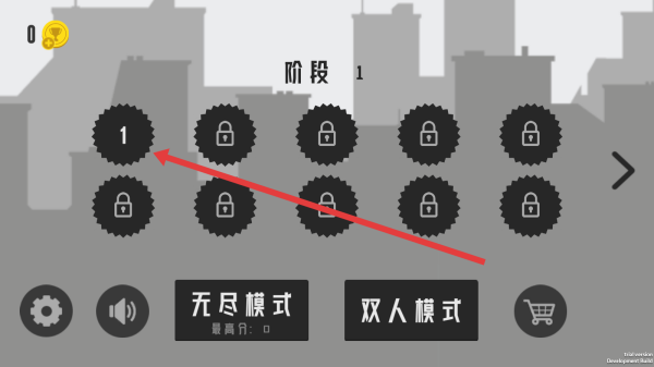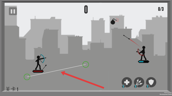 2、阶段选择页通过点击阶段1的关卡1,进入该关卡的战斗场景,准备操控火柴人射手战斗。