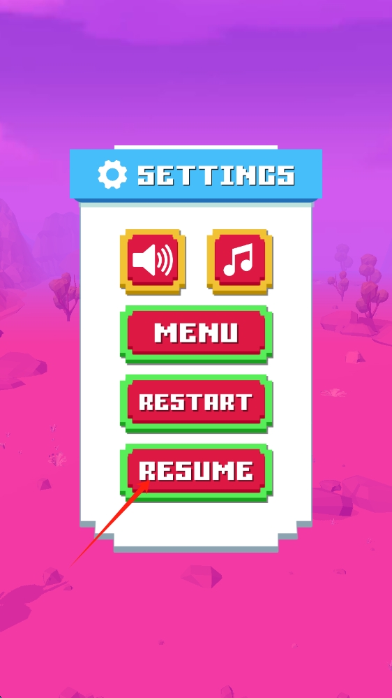 2、游戏内设置界面,点击RESUME,继续之前的游戏进程,回到飞行场景,点击继续游戏。