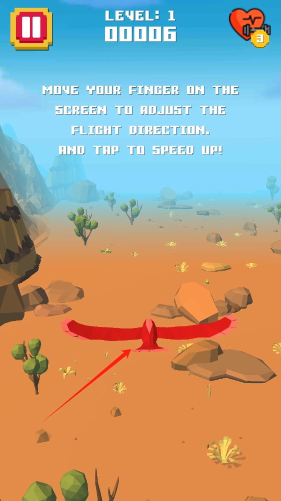 3、在LEVEL-1飞行场景,跟随提示,移动手指调整飞行方向,点击屏幕加速,躲避障碍,滑动移动人物。