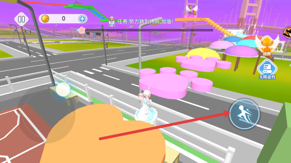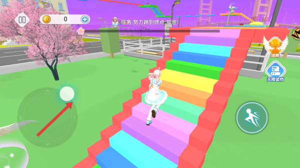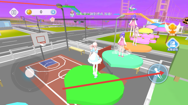 1、开启游戏,进入彩虹桥页面,根据任务提示努力跳到终点,操控角色沿着场景中的路径奔跑跳跃。