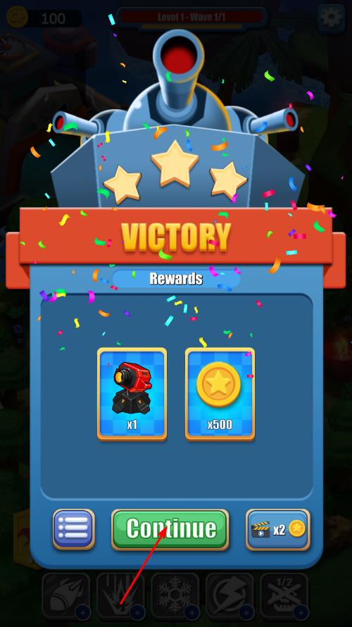 3、成功抵御所有波次敌人,进入胜利界面,获取奖励,点击Continue继续挑战更高难度关卡,解锁更多防御塔和技能。