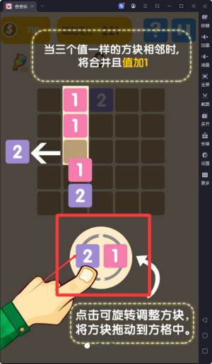 1、玩家需要将随机出现的数字方块精准拖拽到2048游戏格中,三个相同数值方块可合并升级为更高数值,考验玩家的策略思维。