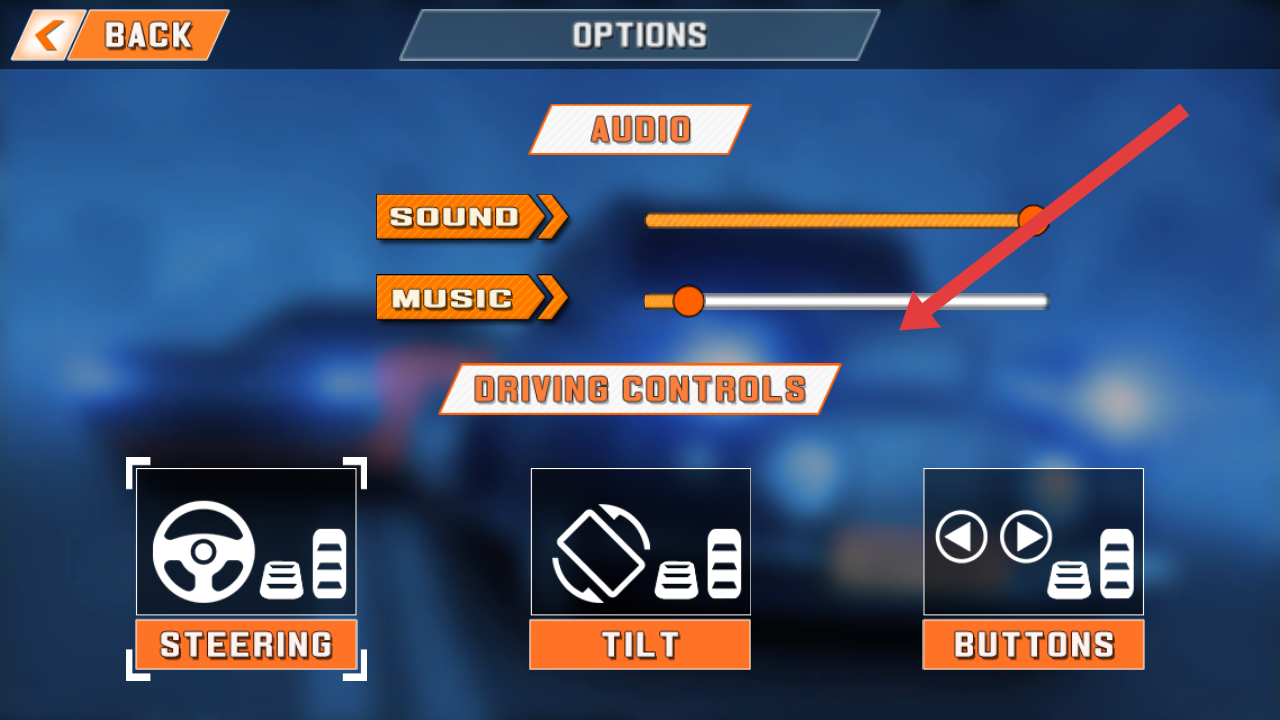 1、进入游戏的OPTIONS设置界面,找到AUDIO板块,根据自己的操作习惯选择方向盘、倾斜感应或按键模式。