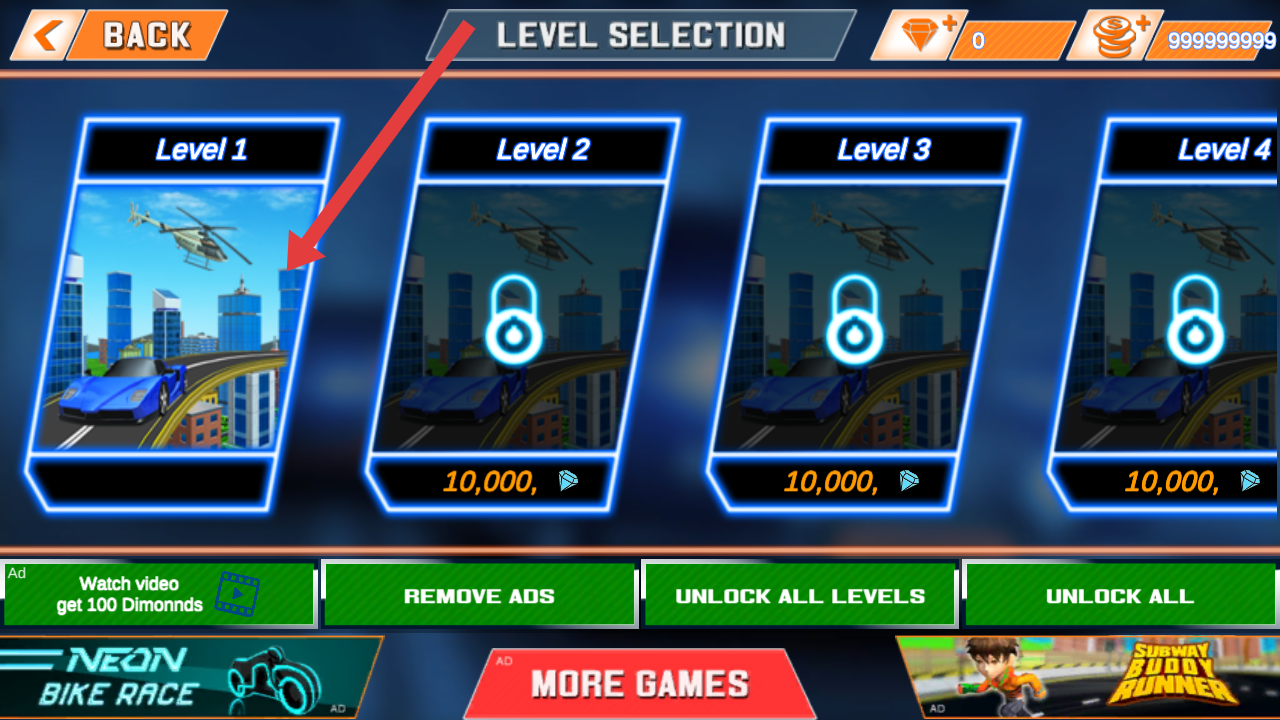 2、退出设置的界面,进入LEVEL SELECTION关卡选择页,点击左侧未上锁、显示蓝色赛车与直升机场景的Level1。