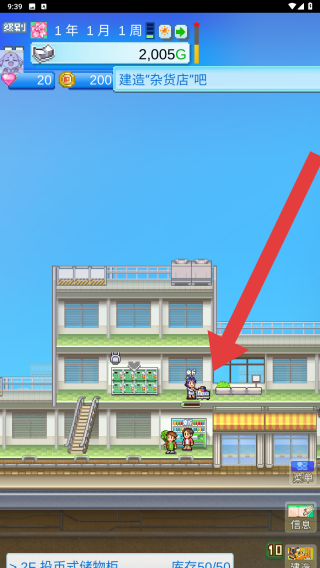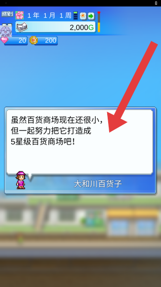2、显示初始阶段信息,有1年1月1周等时间、资源2000G,大和川百货子鼓励玩家将小百货商场打造成5星级,是模拟经营类开局引导内容。