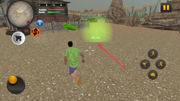 2、留意绿色光圈等特殊标识,靠近它们可能触发特定任务或获得奖励,同时利用虚拟摇杆操控角色移动,探索城市各个区域。