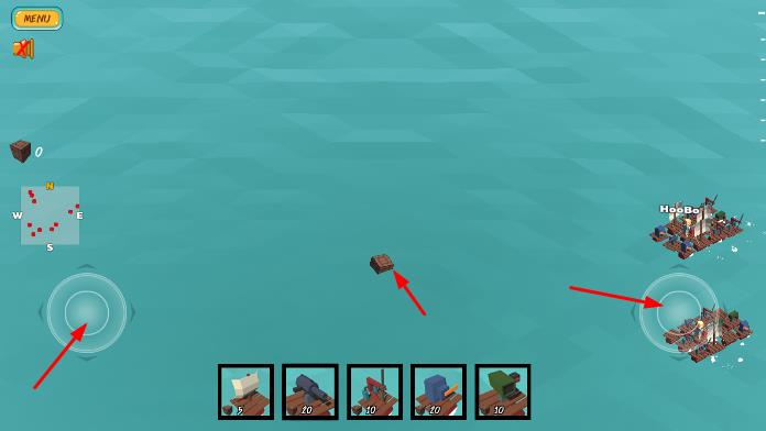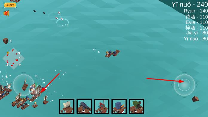 1、通过屏幕左侧和右侧的虚拟摇杆,分别控制角色移动和视角转动,移动角色收集海面上的物资。