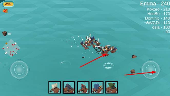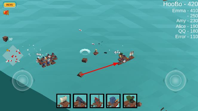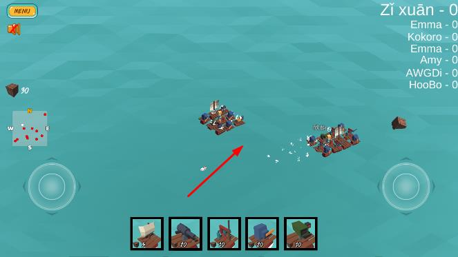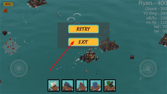 3、屏幕右侧会显示玩家和其他玩家的得分,点击EXIT退出,继续努力在海上生存,解锁更多不同的木筏。