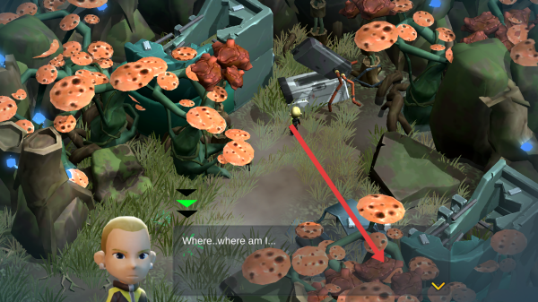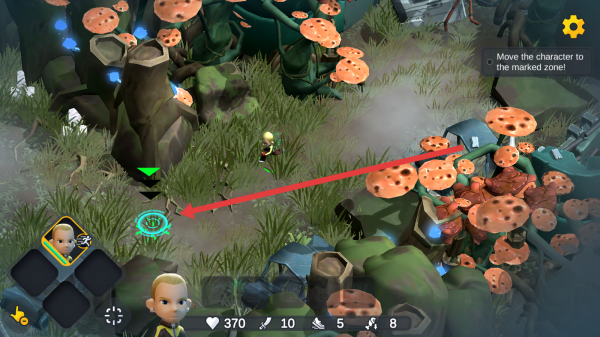 1、角色身处陌生蘑菇丛林,跟随红色箭头指引方向移动,探索环境同时留意界面提示信息。