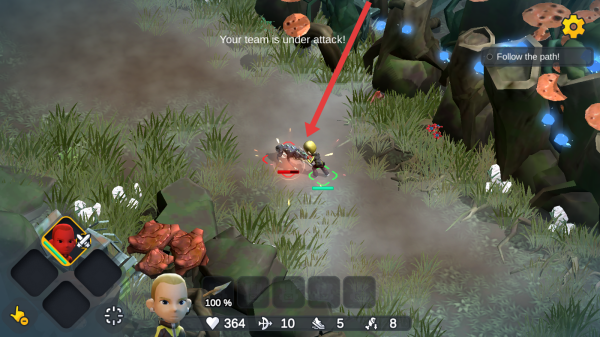 3、遭遇攻击提示Your-team-is-under-attack!后,按红色箭头指向,让角色前往战斗区域抵御敌人进攻。