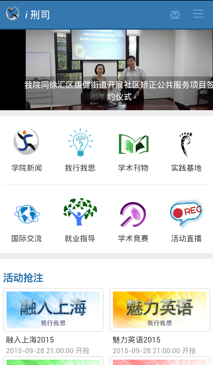 i刑司手机客户端是上海政法学院刑事司法学院的移动信息平台,第一时间将学院新闻、通知公告以及活动报名等事项推送给全体刑事司法学院学生。