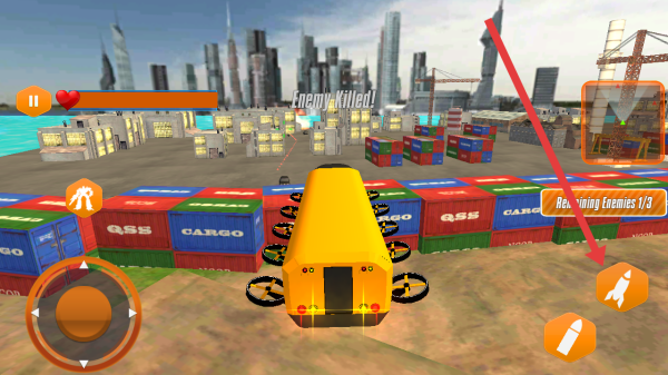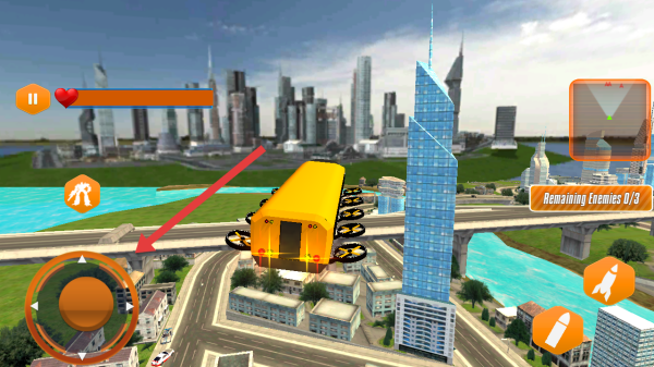 1、通过左侧虚拟摇杆来进行操控飞行校车,在城市上空进行灵活移动,开启战斗前的位置调整。