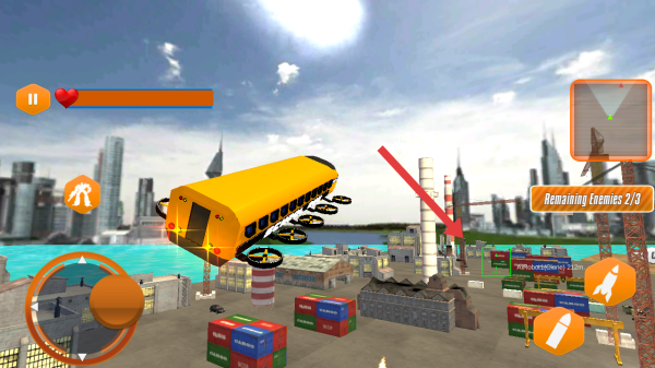 3、跟随系统指引追踪标记的敌人,操控校车飞向目标的区域,持续作战直至清除所有敌人。