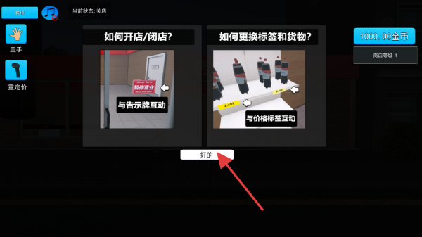 2、在游戏的提示界面,阅读完开店/闭店以及更换标签和货物的说明后,点击好的按钮,进入游戏主界面。
