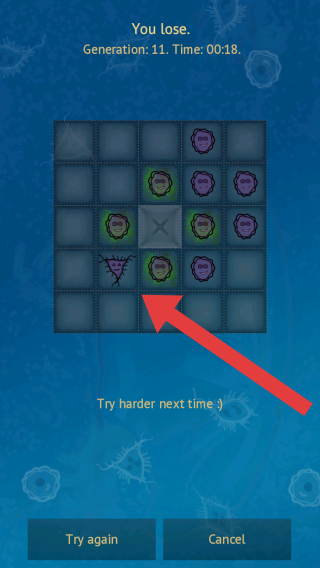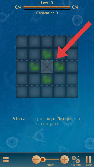 2、中间是带网格的区域,有绿色孢子,提示选择空单元格放置第一个孢子开始游戏,底部有Speed、Strategy、Pause等操作按钮。