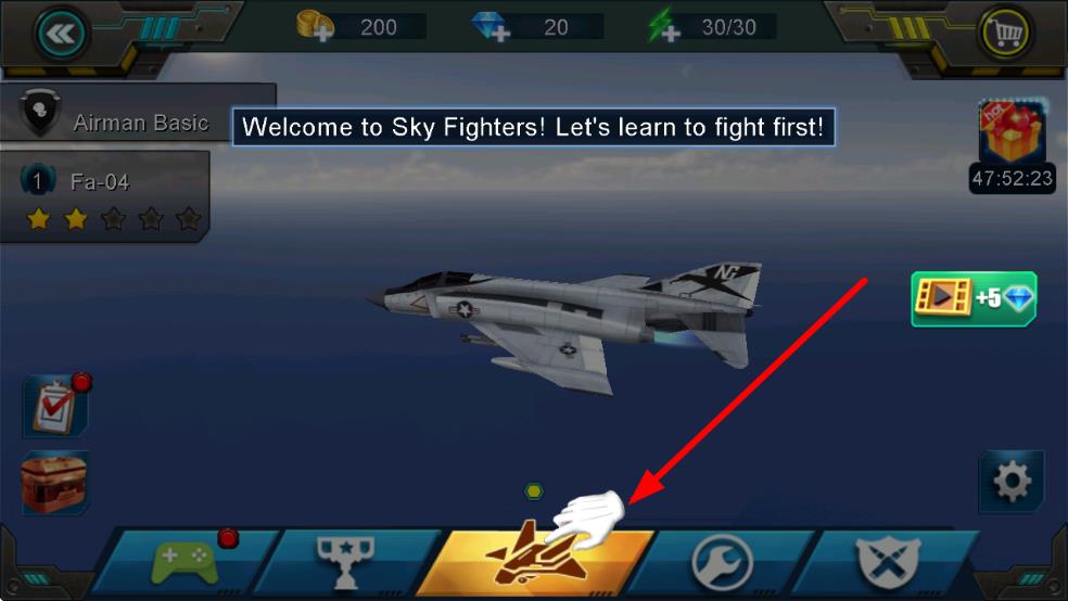 1、按提示点击下方战机图标,进入战斗地图选择,开启空战训练,跟着引导学习基础战斗操作。