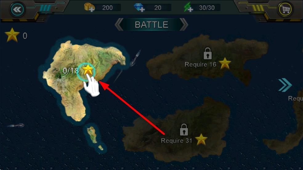 2、战斗地图页,选标有指向带星号的地图 ,进入该区域战斗,完成任务可获取星星,解锁新的关卡。