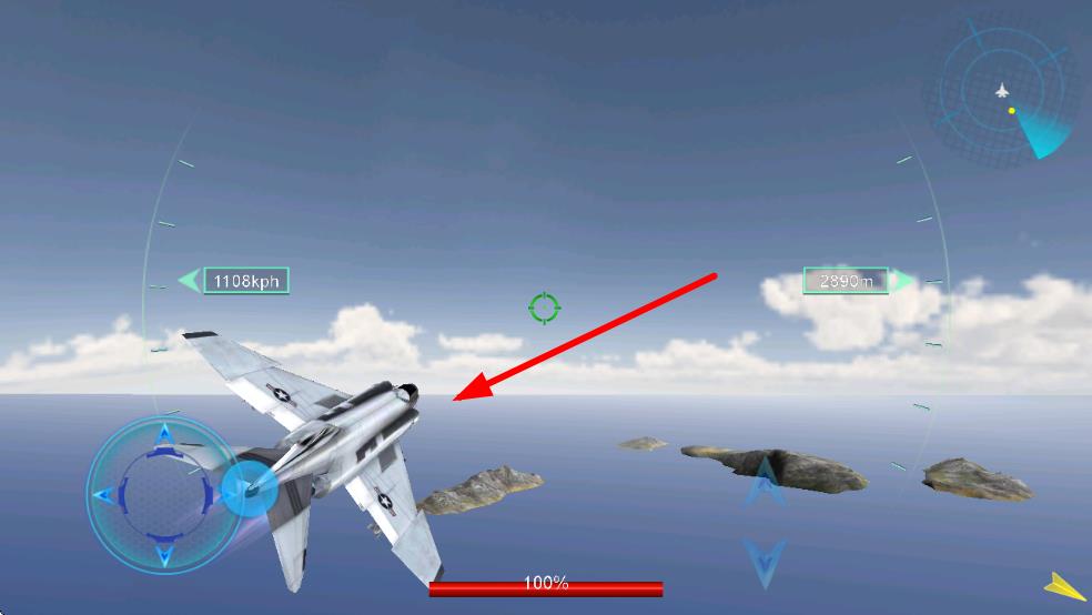 3、用左下角虚拟摇杆调整飞行方向,瞄准敌方目标,利用武器系统攻击,同时规避敌方火力,完成任务。