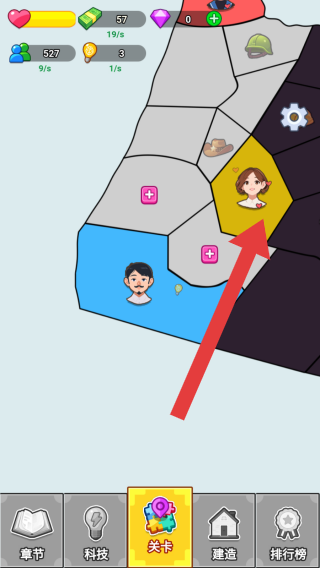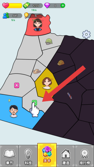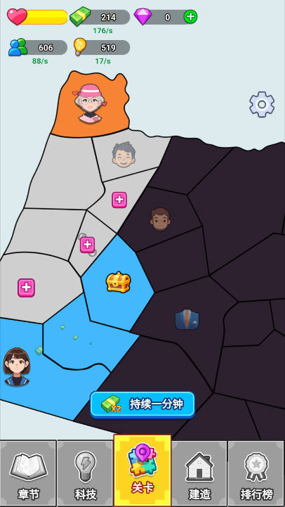 1、底部有章节、科技、关卡、建造、排行榜等功能按钮,是游戏有资源管理、关卡挑战、建造升级等玩法。