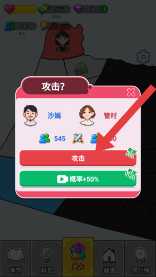 3、呈现攻击的标题,点击攻击的按钮、概率+50%看广告提升选项,底部有章节、科技等功能按钮,呈现战斗决策环节。