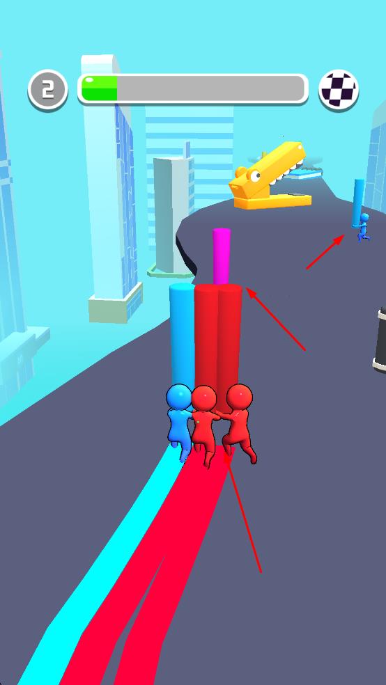 2、收集的柱子会在小人身后延伸,同时可以与其他颜色小人合作,共同收集不同颜色的柱子,为完成关卡任务奠定基础。