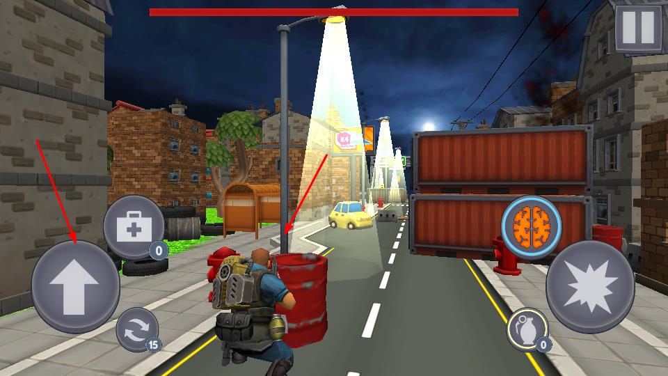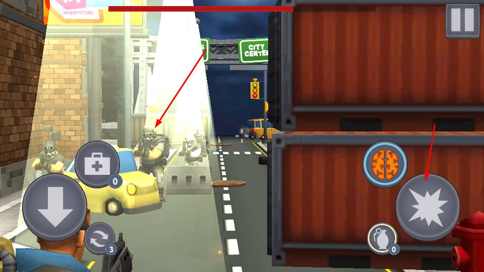 2、战斗进程里,左下角方向键组精准控制角色移动,利用场景物件创造掩体或战术优势;右侧技能按键大脑图标可触发特殊能力、爆炸图标释放范围攻击。