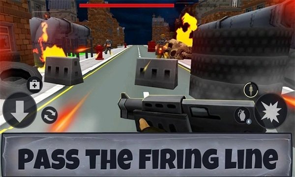 3、当遭遇身着防化装备、依托汽车与路障设防的敌方士兵时,通过方向键灵活走位,交替使用普通射击与技能按键,精准输出突破防线。