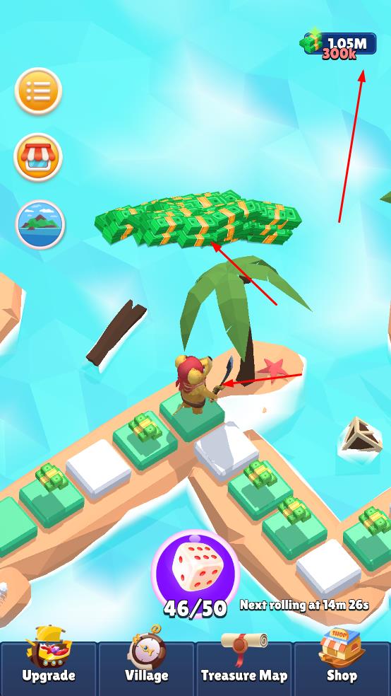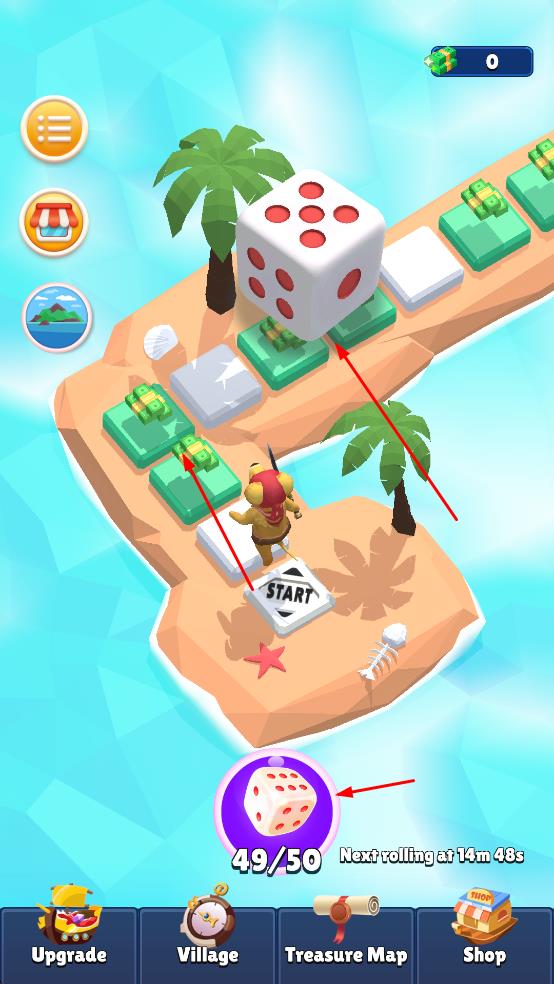 1、操控海盗角色在岛屿场景中移动,通过点击下方的骰子按钮让角色前进,这是开启游戏的关键操作,顺利开启游戏之旅。