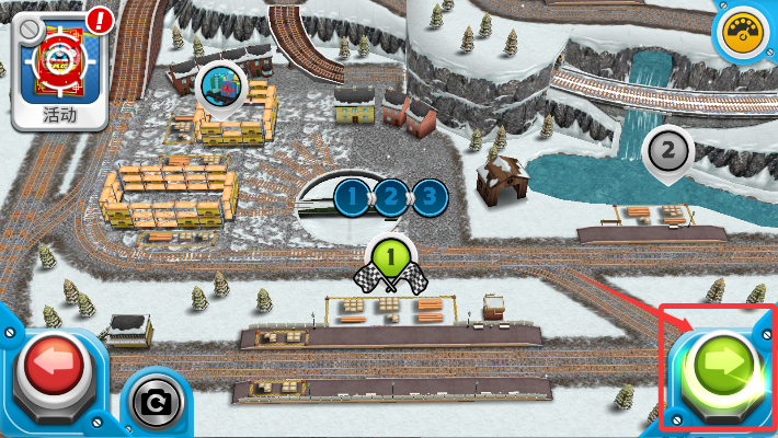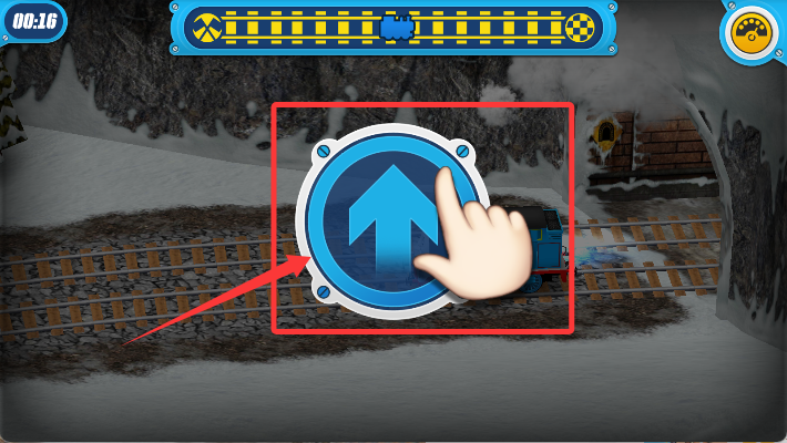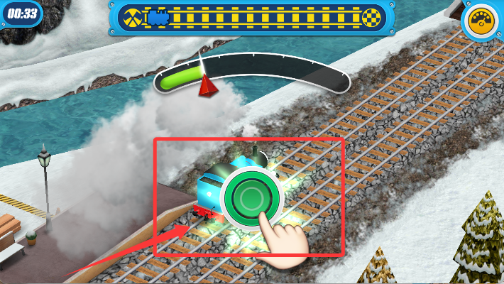3、遇到加速标志时,快速按下绿色加速键让火车瞬间提速超车。