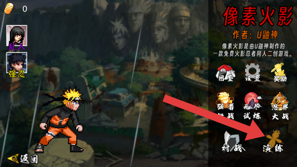 1、显示主界面,有挑战、无尽试炼、忍界大战、对战、演练等功能按钮,可点击演练先进行试炼。
