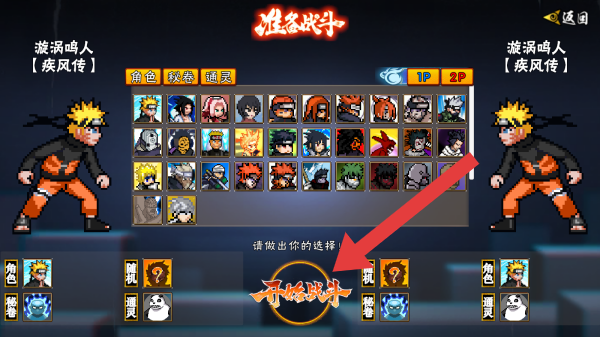 2、是准备战斗的界面,可选择角色、秘卷、通灵,能进行1P、2P对战,点击开始战斗的按钮。