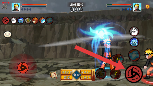 3、这是演练模式战斗画面,呈现技能释放、血条等战斗元素,有设置位置、复位等操作按钮,属于像素风格的火影题材格斗相关界面。