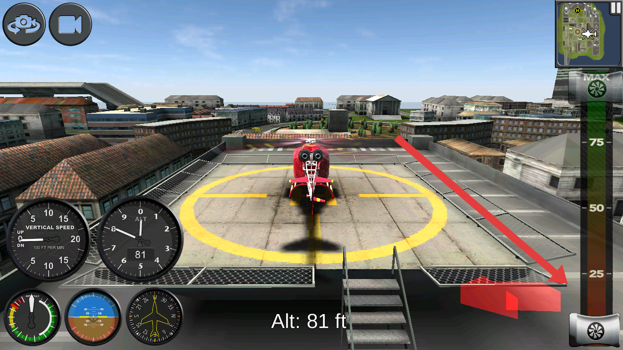 1、在停机坪启动直升机时,需要调节右侧油门杆提升到最大的动力,结合仪表盘数据,让直升机平稳起飞。