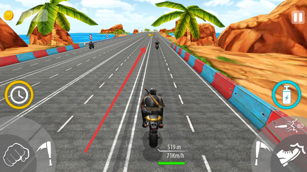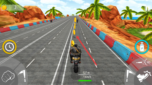 暴力摩托死亡竞速是一款极具刺激感的摩托车模拟驾驶竞速佳作,以真实的驾驶体验为核心,融合竞速与竞技元素,可在游玩中感受速度与激情的碰撞,体验飞驰的极致快感,在这场无规则的比赛中,用户不仅要比拼速度,还能使用武器和道具展开对抗。