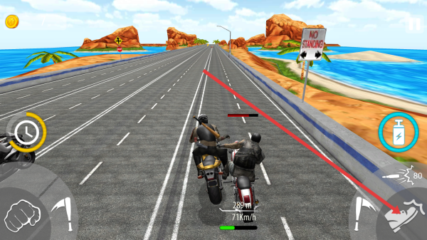 2、当遇到前方有敌人车辆阻碍时,利用屏幕上的攻击按钮点击右下角的靴子标记,踹向敌人,对敌人进行攻击。