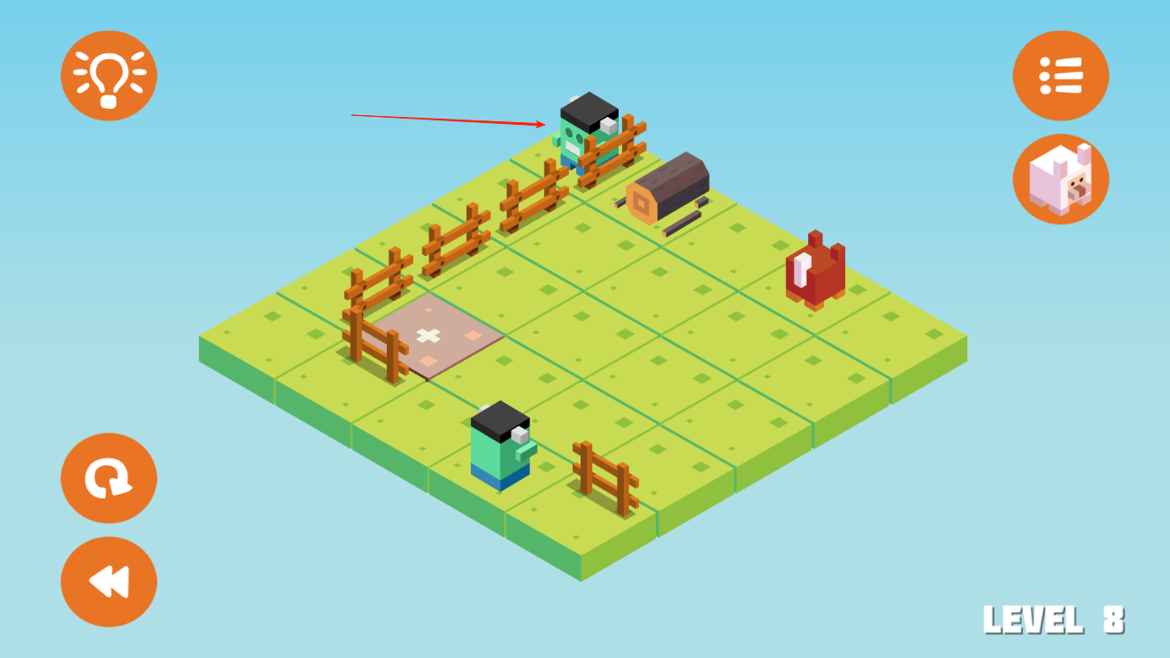 1、查看当前关卡中小鸡的被困位置与僵尸的位置,按照图中箭头滑动小狗,靠近僵尸消灭掉。