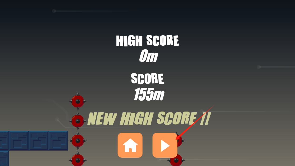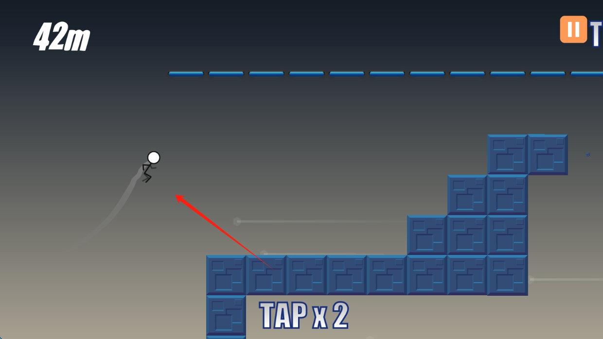 2、进入游戏操作场景,根据箭头提示,操控火柴人,按照指定路线移动,躲避障碍,点击跳跃。