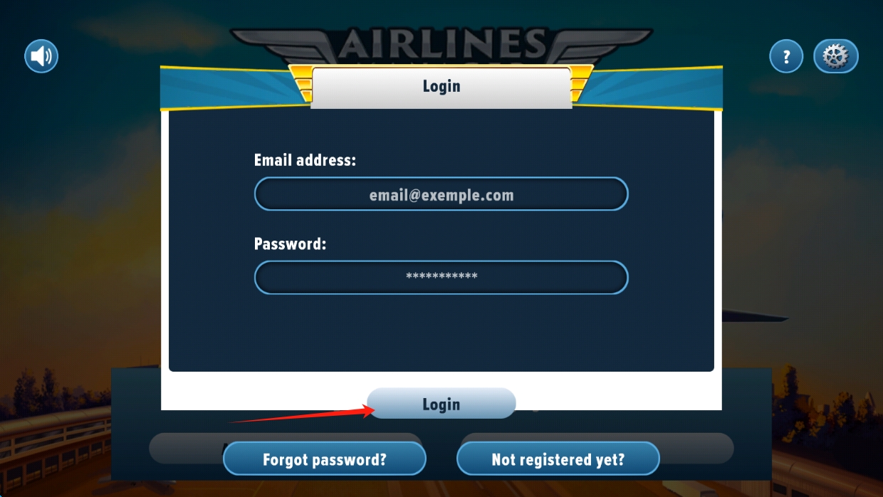 2、进入游戏登录界面,根据箭头提示,输入邮箱地址和密码,点击登录按钮,点击登录。