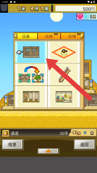 2、建筑选择界面,分为设备、设施、店铺三类,所指是设施类中的一种建筑,底部显示通道价格为30币,还有信息和返回按钮。