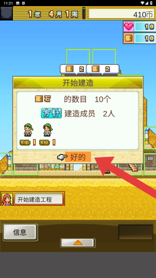 3、显示建造所需石的数目为10个,方材建造成员为2人,点击好的确认按钮,底部有开始建造工程提示与信息按钮。